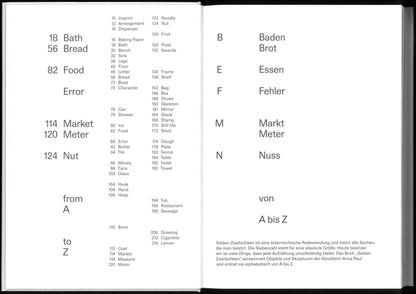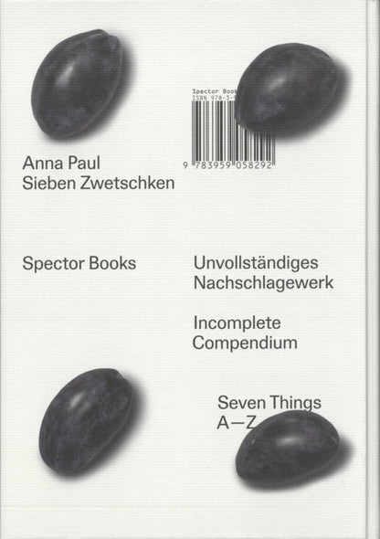 Analogous to the "Sieben Zwetschken" exhibition, the monograph takes the form of an incomplete encyclopedia and provides an insight into the diversity of her work. It assigns objects from her situational work to associative themes and, with texts by Christie Pearson, Katia Porro, Stefanie Sargnagel and Robert Walser, tells of objects and rituals, objects made of flour and water, glass or wax, of social structures and their possibilities for participation.