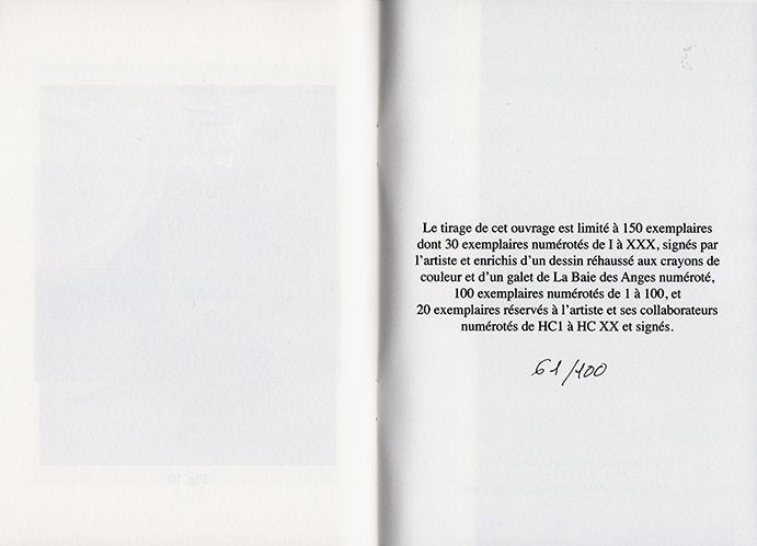 Le tirage de cet ouvrage est limité à 150 exemplaires dont 30 exemplaires numérotés de I à XXX, signés par l'artiste et enrichis d'un dessin rehaussé aux crayons de couleur et d'une galet de La Baie des Anges numéroté, 100 exemplaires numérotés de 1 à 100, en outre 20 exemplaires réservés à l'artiste et ses collaborateurs numérotés de HCI à HCXX et signés.