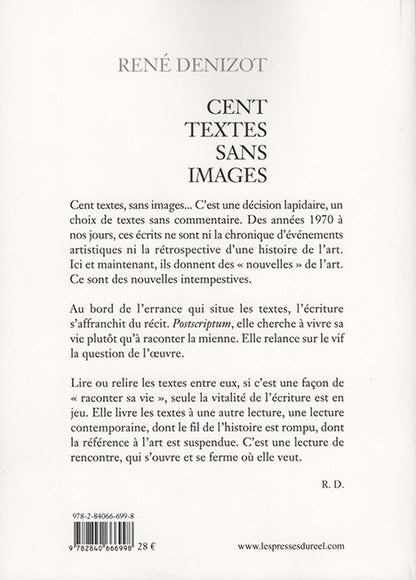 Cent textes, sans images... C'est une décision lapidaire, un choix de textes sans commentaire. Des années 1970 à nos jours, ces écrits ne sont ni la chronique d'événements artistiques ni la rétrospective d'une histoire de l'art. Ici et maintenant, ils donnent des « nouvelles » de l'art. Ce sont des nouvelles intempestives.