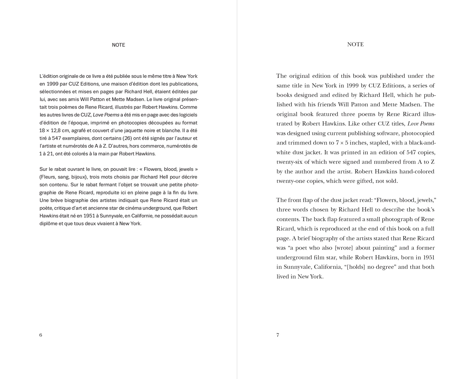 Reprising the rare, eponymous book published by Richard Hell through CUZ Editions in 1999, Love Poems features three poems by Rene Ricard and a series of black-and-white drawings by Robert Hawkins.